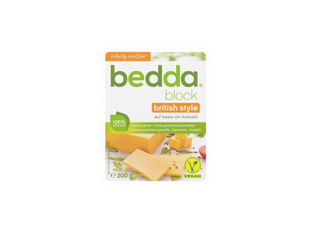 Bedda blok British Style je veganskou alternativou sýra čedar na bázi kokosového oleje. Neobsahuje lepek, laktózu ani sóju, takže je vhodný i pro alergiky. Výrobek je navíc obohacený o vitamín B12 a vápník, které patří často mezi problematické složky veganského jídelníčku.