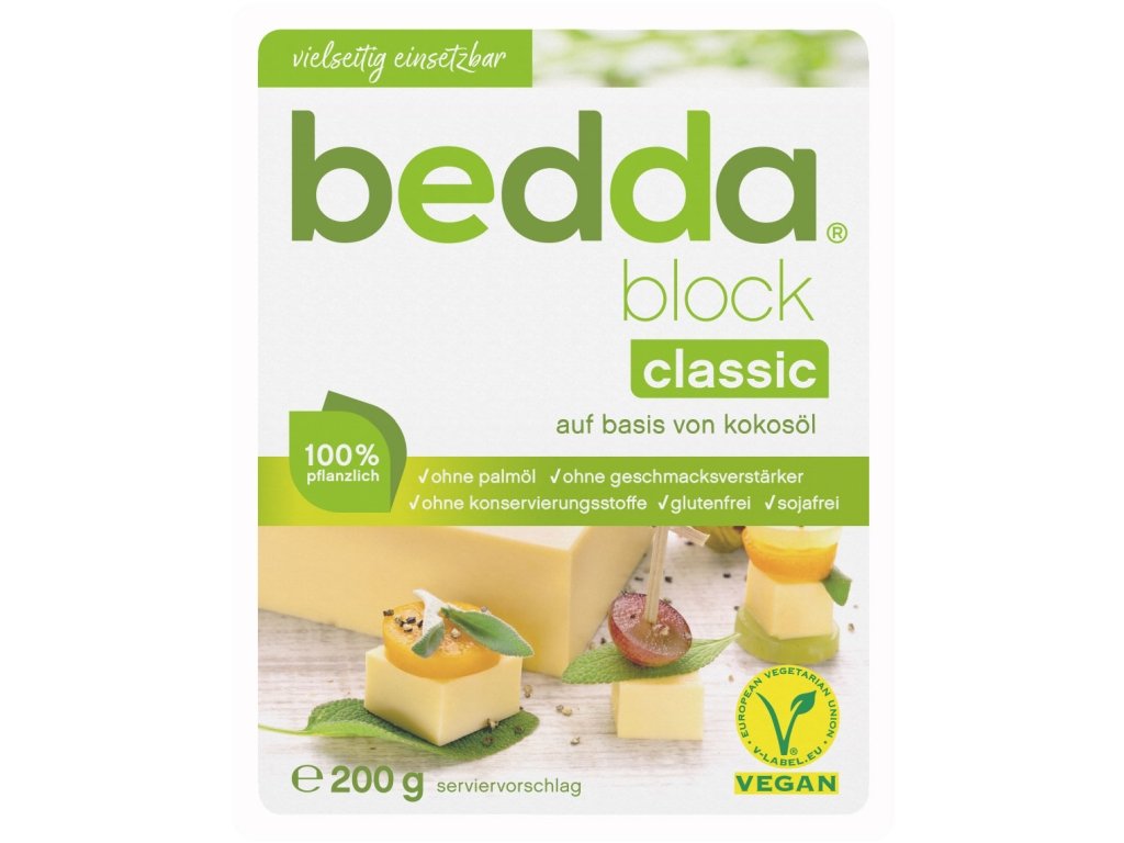 S alternativou sýra Bedda blok jemný můžete v kuchyni naplno pustit uzdu své kreativitě. Bedda blok jemný je vhodný pro přípravu studených i teplých pokrmů, snadno se strouhá a krájí na plátky. Jeho základ tvoří kokosový olej, který je zdrojem zdravých tuků, esenciálních minerálů a vitamínů. Neobsahuje umělá dochucovadla, konzervanty, palmový tuk a samozřejmě žádné stopy živočišných složek.